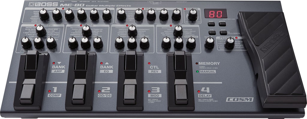 Móvil alimentado por batería y lleno de una selección diversa de amplificadores y efectos BOSS de calidad insignia.  El ME-80 es el procesador de tonos compacto ideal para guitarristas de alto rendimiento. Una interfaz amigable basada en perillas hace que sea fácil marcar sonidos geniales en segundos, mientras que los modos de operación, fácilmente seleccionables, ofrecen la flexibilidad de activar/desactivar individualmente el estilo stompbox o la recuperación instantánea de configuraciones complejas de efectos múltiples. Los nuevos y únicos conmutadores de pedal, ofrecen el doble de control que los diseños anteriores para un cambio de efectos eficiente e intuitivo, selección de parches y modelado de sonido en tiempo real mientras se toca en el escenario. El software gratuito BOSS TONE STUDIO desbloquea aún más posibilidades tonales, proporcionando una interfaz gráfica genial para ajustar y organizar sonidos en su computadora.